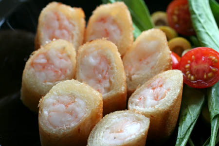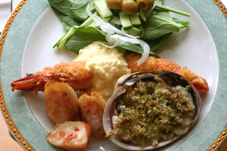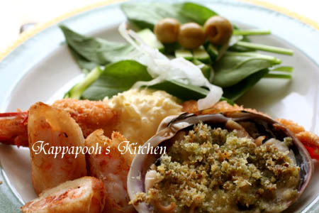 有頭海老はフライにして、前日夫に好評だった、海老のパン巻き揚げ、大あさりのオーブン焼きジェノベーゼ風味も一緒にワンプレートにして・・。