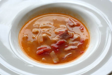 鍋にオリーブオイルを入れて、ニンニク、玉ねぎのスライスを炒めて、ベーコンを加えてさらに炒めます。