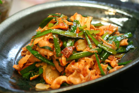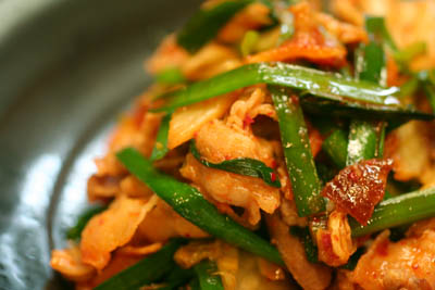 豚バラ肉をニンニクとともに炒めて、ニラ、キムチを加えて、酒、塩、コチュジャンで味つけしました。