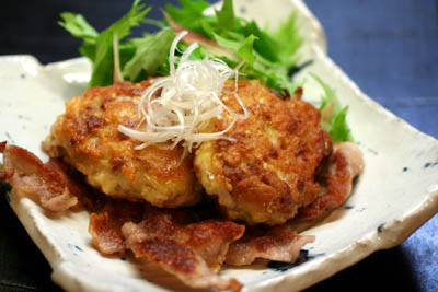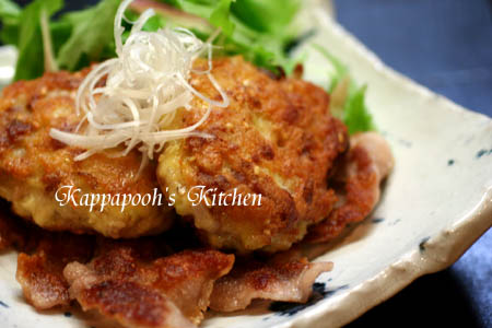 細かく切った豚バラ肉に、小麦粉、溶き卵、すりおろした生姜、みじん切りしたねぎ、塩・コショウ、白ごまをして丸めて多めの油で揚げ焼きします。