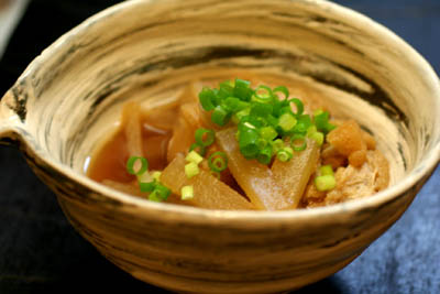 大根と油揚げを煮ておいたものをちょっと冷やして・・・。