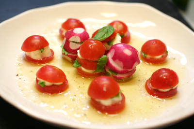 プチトマトの大きさに合わせてモッツァレラチーズを抜き型で抜いて間にきざんだバジルを挟んで重ねました。