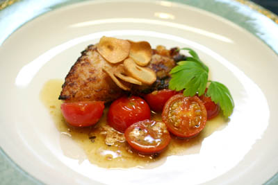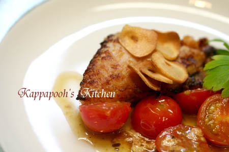 お皿にプチトマト、鰆を盛りつけ、ニンニクチップを添えて出来上がり。