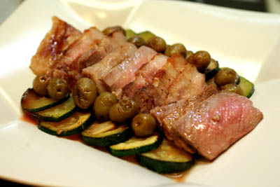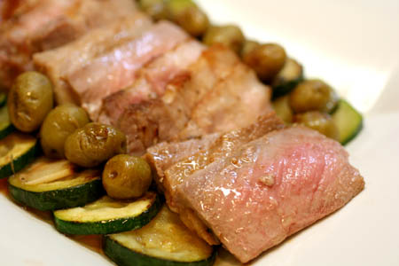 先日作って美味しかった塩豚をまた作って冷蔵庫に保存しておいたので、それを取り出して、塊りのまま、ズッキーニと一緒に蒸し焼きしました。