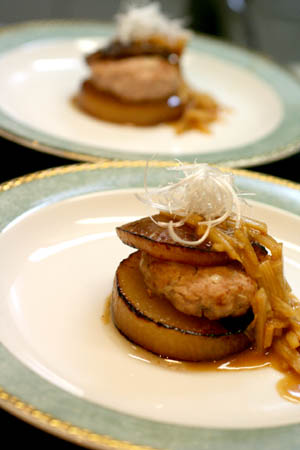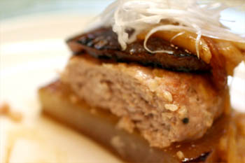 器に、大根、豚バーグ、薄く切った大根を重ねて、長芋のソースをかけて、白髪ねぎを乗せて出来上がり。