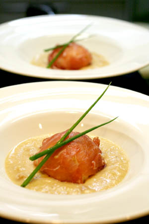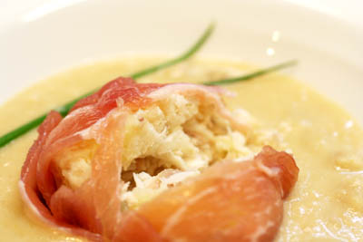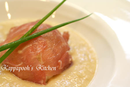 *ヒラメの生ハム包み・ひよこ豆のスープ添え*