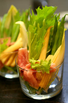 サラダは、チコリ、いんげん、ベビーコーン、水菜、生ハムです。