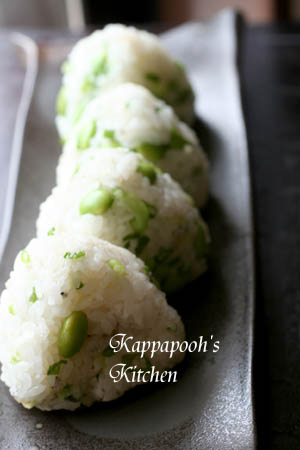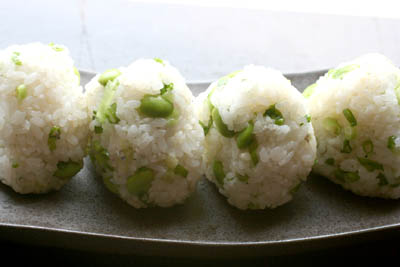 じゃこをごま油で炒めて、きざんだねぎ、えだ豆と合わせておにぎりを握りました。