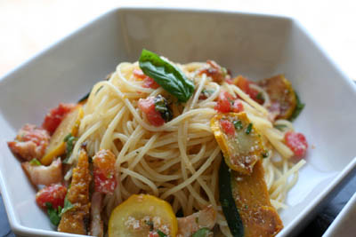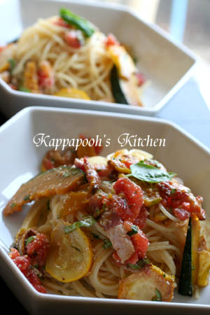 フライパンにオリーブオイルをひき、にんにくのスライスを炒め、パンチェッタ、ズッキーニ、かぼちゃを一緒に炒めます。