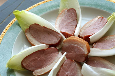 チコリはいつもお皿に並べますが、お料理の本に立てて盛り付けてあったのを思いだして、ガラスの器に立てて盛り付けてみました。