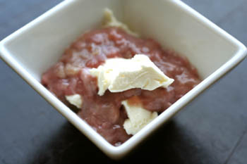 一夜干しの状態にして、翌日、わたの塩を手でていねいに取り除いてボールにわたの中味をしごきだします。