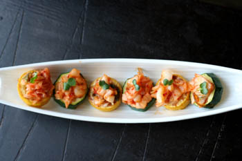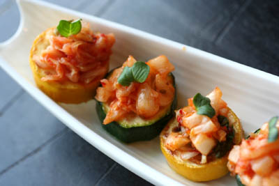 ズッキーニを取り出したフライパンで細かく切ったキムチを炒めて、ズッキーニの上に乗せます。