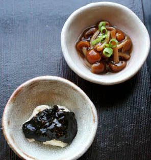 なめこおろしうどんで作ったなめこをびんに詰めておいたので、それを出して、自家製の海苔と実山椒の佃煮にこちらもクリームチーズを合わせて。