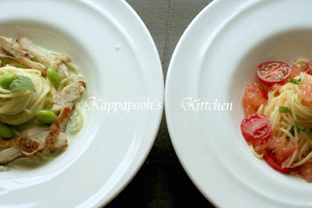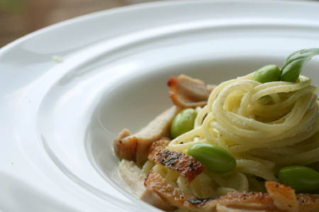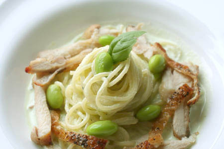 ゆで上がったパスタは、冷水でしめてしっかりキッチンペーパーなどで水を切り、クリームソースと混ぜ合わせて、器に盛り、周りに鶏肉、とえだ豆を散らしてできあがり。