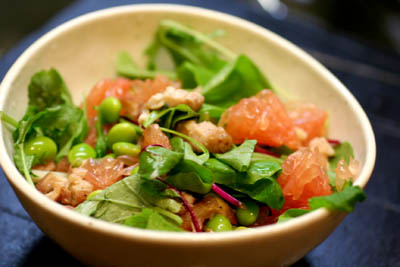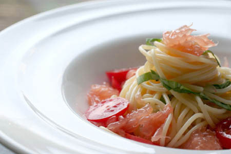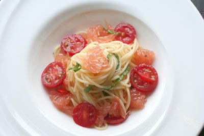 つぶしたニンニクを浸したオリーブオイル、適当に切ったプチトマト、グレープフルーツ、細かく刻んだバジル、クレイジーソルトで合わせただけ。