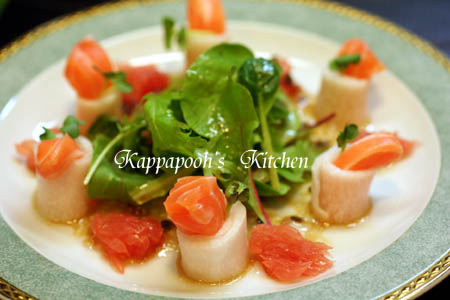 最近買った本 『WaSaBi』 の中に、じゃがいもと刺身のサラダっていうのがあって、そのサラダにトマト(だったと思う)も入ってて、へ~って思って作ったサラダです。