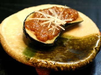 油をひいたフライパンで内側に切れ目を入れた茄子を両面焼いて、味噌を塗り白髪ねぎを添えてできあがり。