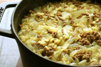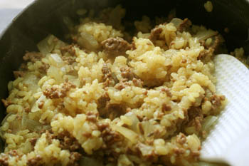 玉ねぎとひき肉をにんにくで炒めて、こちらもカレースパイスで味付けします。