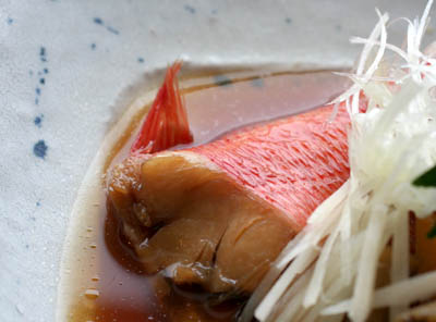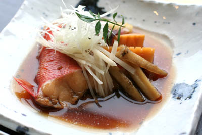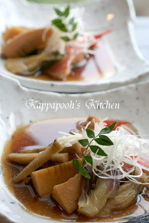 昆布と鰹節で取ったおだし、酒、砂糖、醤油、みりんで濃い目の煮汁を作り、金目鯛、生姜、ごぼう、筍を入れて、アルミホイルで落としぶたをして、煮ます。