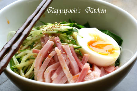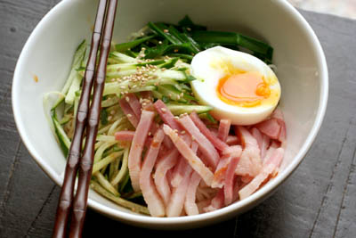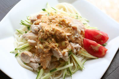 お皿に、麺、きゅうりを盛りつけ、タレをかけて出来上がり。