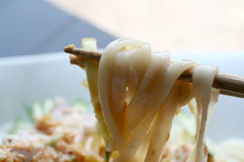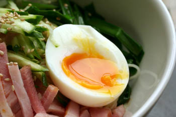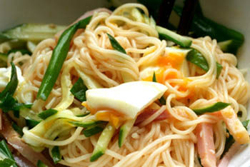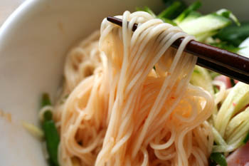 ゆで上がった麺は、水で洗い、ぬめりを取って水でしめたあと、ごま油とレモン汁を加えてなじませます。