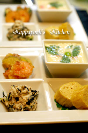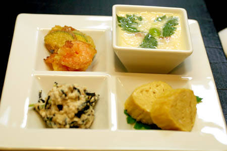 だし巻き卵は、プレートにおさまるように、焼いた後で巻きすで巻いてちょっと丸く仕上げました。