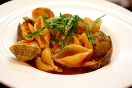 野菜のソースをひいて、パスタを盛り付け出来上がり。