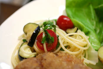 付け合せの冷製パスタはお代わりもあります。
