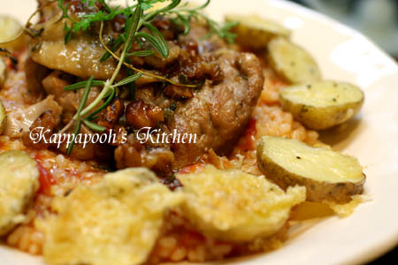 器にリゾットを盛り付け、その上に鶏肉を乗せ、オーブントースターでオリーブオイルとチーズで焼き色をつけたジャガイモを添えて完成。