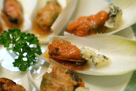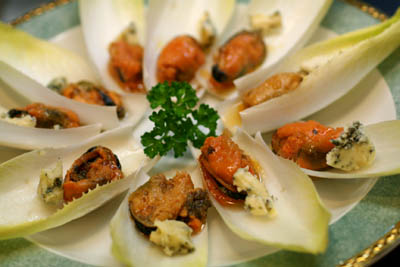 缶詰のムール貝に、ゴルゴンゾーラに似たブルーチーズを合わせてチコリに乗せただけです。