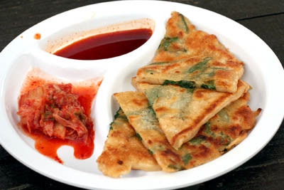 お供はチヂミです~。お昼時に着いたので混み合ってました。
