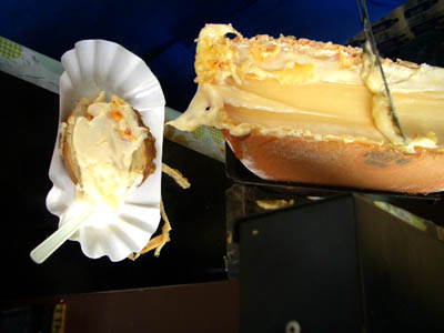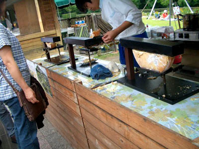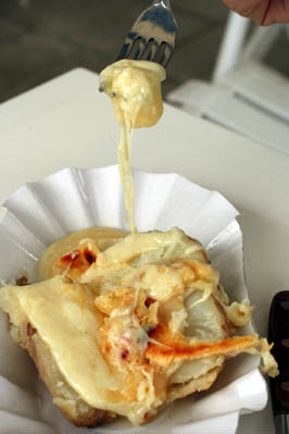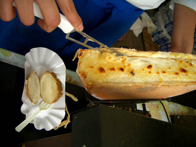 大きなチーズの表面を熱してる屋台が・・。