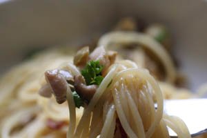 ゆで上がったパスタを入れて、パルメザンチーズをふりかけ、さっと混ぜ合わせて出来上がり。