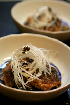 煮汁をまわしかけ、白髪ネギを添えて出来上がり。