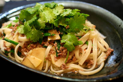 うどんをゆでて、水にさらし、よく水を切って、タレ、ひき肉、ニラと筍と合わせます。