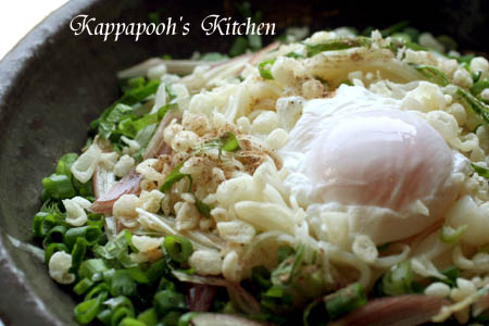 で、うどんと素麺、そして昨日は買い物に行くのをやめたので、冷蔵庫にあるもので、これまた1個だけあったみょうがと、わけぎ、大葉をきざんで散らして・・。