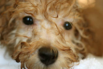 お湯で濡れた毛がピターっとしてるとちょっとダックスみたいな、ミニピンシャーのような顔なんですけど、ちょっとタオルでくしゃくしゃっとすると、こんなみじめな姿です。