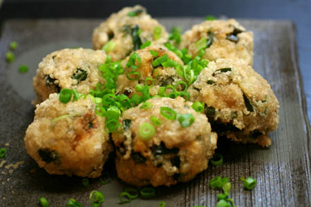 団子状に丸めて片栗粉を周りにつけて低温の油で揚げます。