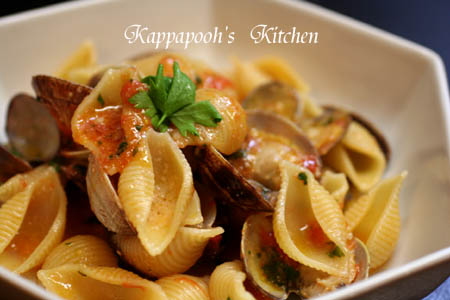 酒を加えて蓋をして、フライパンをゆすり、貝が開いたら、パスタのゆで汁を少し加え、またフライパンをゆすって、混ぜておきます。