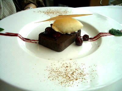 ゆずさんは、ショコラのテリーヌ チェリーのソテーシナモンの香り・バニラアイスを添えて。