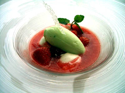 デザート。私は、苺とシャンパンのスープ、ピスタチオアイスクリーム。