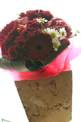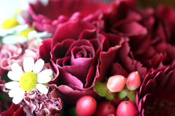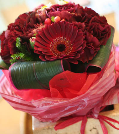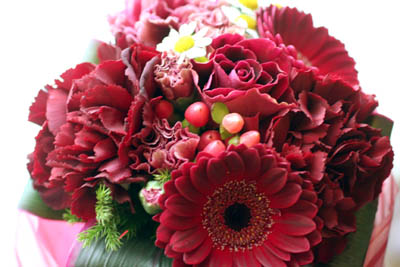 バラやガーベラ、カーネーションが全てこの深い赤です。