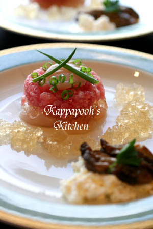 ホタテをスライスして、その上にジュレ、そしてマグロのタタキを重ねたものです。