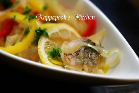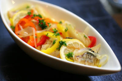 野菜を並べたバットにアジは適当に切って一緒に並べて、ワインビネガー、オリーブオイルをふりかけ、レモンの薄切りを上に並べて冷ましながら全体をなじませます。