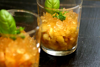 ブイヨンスープをゼラチンで固めて、小さな泡だて器で細かくしておきます。