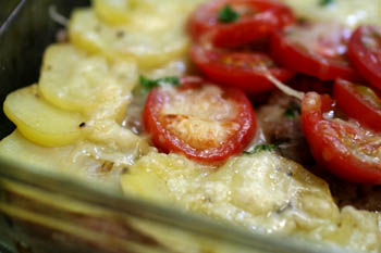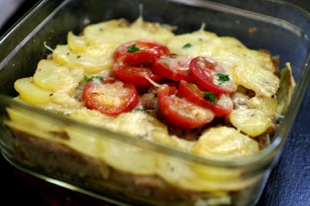 耐熱容器に適当に切ったキャベツを敷き、クレイジーソルトをふりかけ、その上にひき肉を敷き詰め、スライスしたジャガイモを並べてラップをして電子レンジで3~4分加熱します。