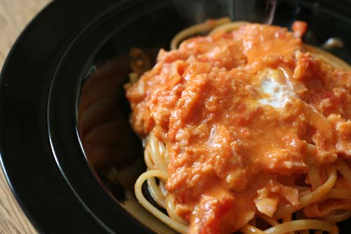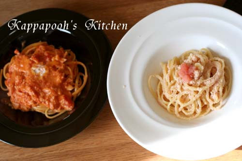 久々の明太パスタとトマトクリーム味。夫と二人、興奮しながら味わいました。