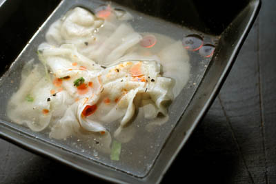鶏団子が煮えたら、セリを入れてさっと火を通し、鶏団子、セリを先に器に盛り付けます。