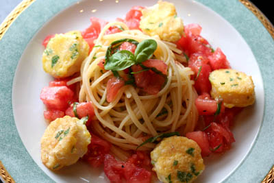 *トマトとバジルの冷製パスタ・ホタテのバジル風味フピカタ添え*