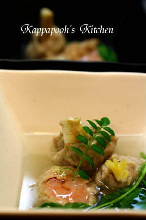 煮汁に水に溶かした芳野葛を加えてとろみをつけ器の鶏団子に回しかけ、山椒の木の芽を添えて出来上がり。